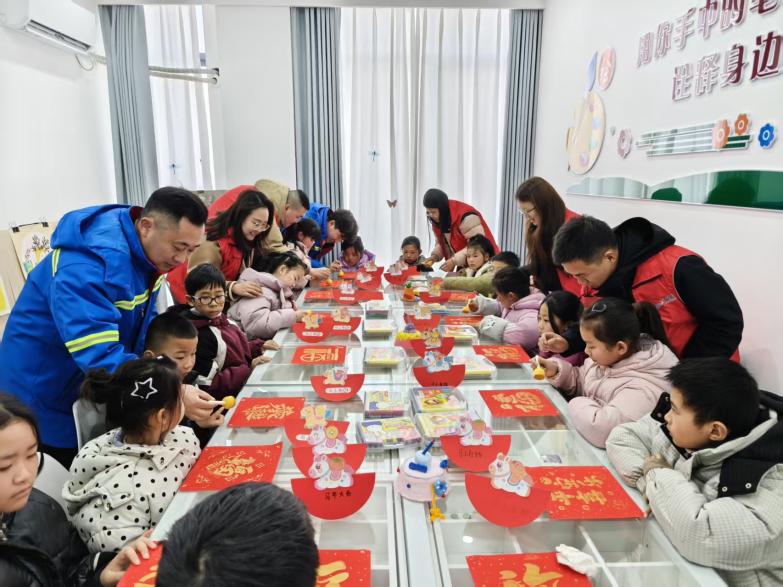 活動當日下午,在陳家港鎮未成年人保護工作站的圖書室里,20名留守兒童在志愿者的陪伴下認真閱讀課外書籍,沉浸在書香之中。隨后的游戲環節里,志愿者們與孩子們玩起擊鼓傳玩具的游戲,音樂聲時而急促、時而舒緩,每當鼓聲停下,拿到玩具的孩子便大方地說出一個帶“馬”字的四字詞語,現場歡聲笑語不斷。在手工制作室,孩子們在志愿者的耐心指導下,動手粘貼馬年玩具,并親手拓印出金光閃閃的“福”字,感受傳統文化的魅力。活動最后,響水港區志愿者們為孩子們發放了新年禮品和壓歲紅包,送上滿滿的新春祝福。